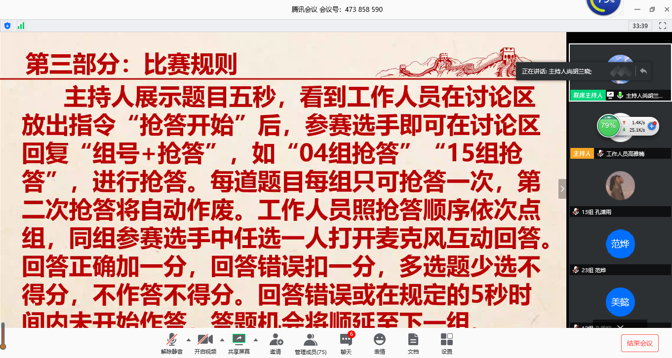 线上会议互动竞赛于5月2日晚上7点在腾讯会议举办,采取团队战的形式,每组3名同学,共有24个小组72名同学参与其中。比赛过程中,主持人展示题目五秒后工作人员会在讨论区放出抢答开始的指令,各团队在讨论区中输入规定的抢答口令进行抢答,按照抢答顺序依次进行打开麦克风进行作答。每位参赛同学都以饱满的热情积极参与到活动中,反应迅速、应答如流,现场氛围良好。每道题抢答结束后,主持人会结合题目做出讲解和拓展。最终通过100道初赛题目和30道加时赛题目的激烈角逐,决出一等奖小组一名,二等奖小组两名,三等奖小组三名,优秀奖小组若干。