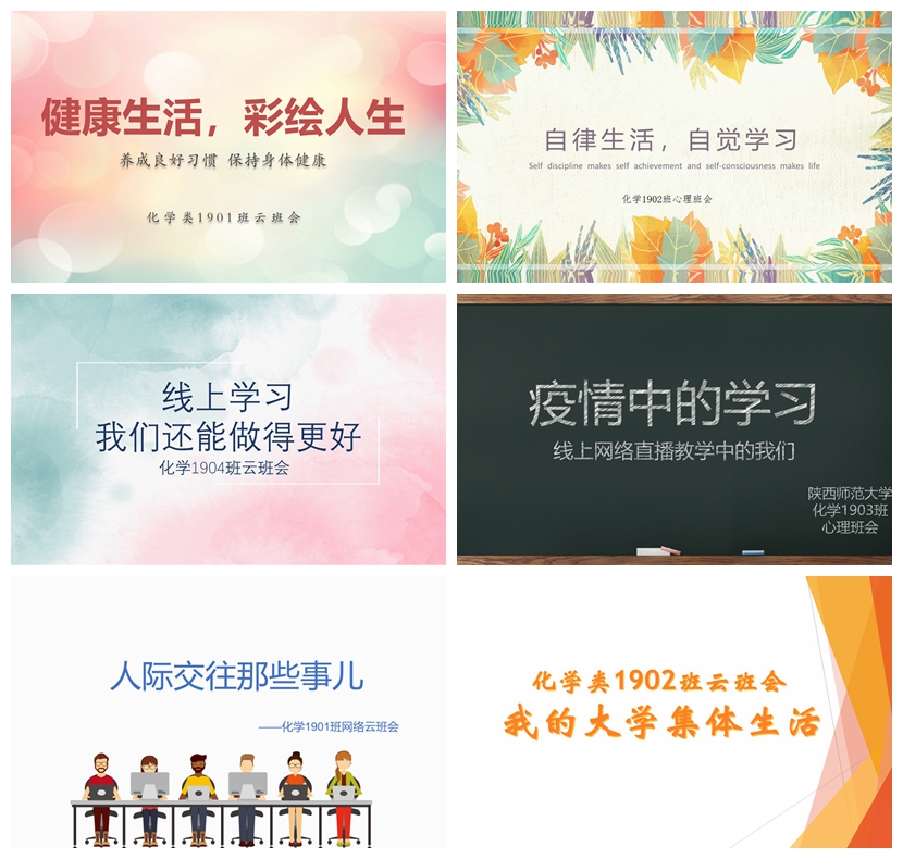 2019级化学(卓越教师实验班)通过观看视频,分析线上学习模式与传统学习模式的区别,揭露网课学习中的不良现象,同时以“作为未来教师,如何看待网络直播授课?”展开讨论,号召同学们学会换位思考,积极适应新模式,树立优良的学风。化学1902班以“自律生活,自觉学习”为主题,通过解释“自律者自由”的含义、讲解自律形成的过程规律、介绍“现场放松”和“想象放松”等解压方法,鼓励同学们养成自觉的习惯,提高学习效率,做到在生活中自律,在学习中自觉。化学1903班以“线上学习”为主题,通过在线分享学习方法、展示学习成果的方式,围绕“网络课程的优点” “行为规范的培养” “时间管理的妙招”等话题展开云端讨论,呼吁同学们积极调整状态,经受住特殊时期对学习意志和生活习惯的考验。