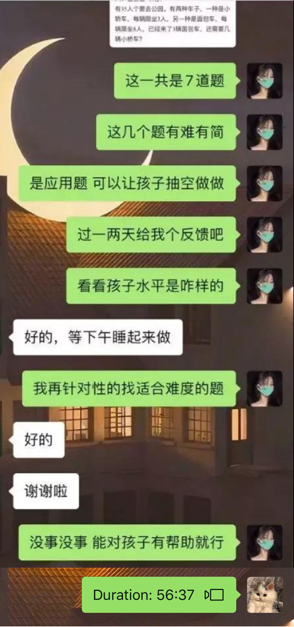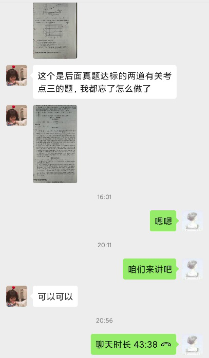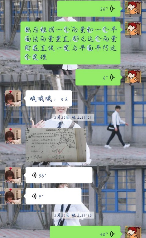 安排的网课也比较多。张梦洁采用了“全天候型”线上辅导,学生随时有知识困惑或者题目疑问都可以找到她,进行语音解答或者视频连线。她认为,这次帮扶活动中自己的定位不是小老师,而是一个可以陪伴她的姐姐或者朋友。本身高三就压力比较大;同时疫情当前,自己的爸爸身处前线,家里的顶梁柱处于危险中,女儿更加难以放心学习。在家里学习,没有老师的看管,没有同学的陪伴,是学生第一次经历这样的情况。她认为,自己能做的,不只是辅导功课,更是陪伴与沟通,不只是解答学习上的问题,更要帮助学生更快地调整情绪,也更快适应这种网上学习。