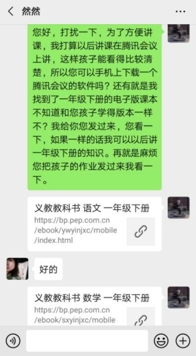 在志愿服务工作期间,李晶晶的主要工作就是帮助那些在一线做防疫工作的医护人员的子女在线上辅导功课。她辅导的是一个一年级的小朋友。第一天与学生家长交流时我还有点紧张,但是通过几天的交流,心中的紧张逐渐消失,同时在与家长和孩子的交流中了解了小朋友的学习状况,并为小朋友制定相应的学习计划。小朋友很萌,每次在辅导完,都会暖心道谢,她就觉得动力满满。