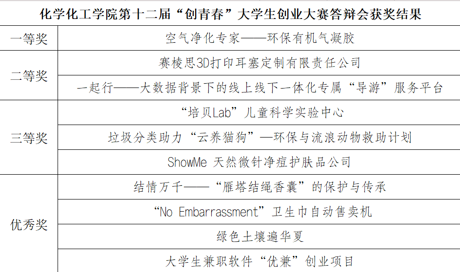 为落实习近平总书记提出的“为青年创新创业开展教育、传递知识、搭建平台、提供机遇”的要求,培养青年大学生的创新意识和创新能力,适应“大众创业,万众创新”的社会氛围,丰富校园创业文化,促进学生对于科研创新赛事的理解,拉斯维加斯娱乐城官网 于11月30日举办了第十二届“创青春”大学生创业大赛答辩会。经作品展示、项目答辩、专家评审,大赛已落下帷幕,现予以公示,公示期为2019年12月1日—3日。期间如有异议,请向拉斯维加斯娱乐城官网 团委反映。