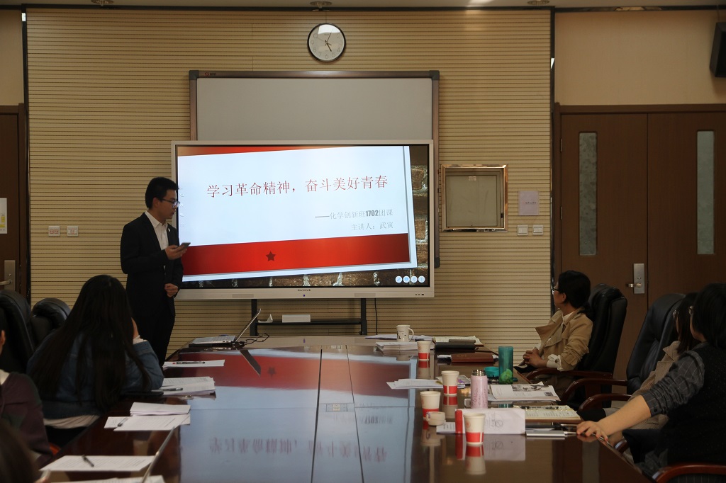 2017级化学创新实验班二班团支书武寅首先为大家分享了《林海雪原》这部影片,并通过对这部影片的简短介绍,突出其中我国共产党的革命奉献精神。之后按照时间顺序,依此解释了“长征精神”、“雷锋精神”、“航天精神”等内涵。最终点出其“学习革命精神,奋斗美好青春”的主题。