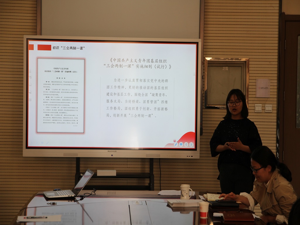 2016级化学三班团支部书记岳越通过提问的方式逐步引入“三会两制一课”的主题,并结合其团支部的特点对其中专有名词进行了专业及详细的解读。告诫团员们应努力加强政治意识,时刻关注团学动态并积极响应共青团团学活动。