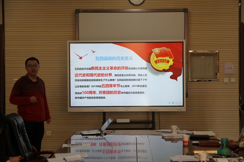 研究生李林峰围绕“五四运动精神”,通过ppt讲解的方式将当时的历史按照“五四运动发生的背景和直接原因”,“五四爱国运动的爆发”,“五四运动之后所造成的影响”三个系列展现于每个人的眼前。同时引用老子在《道德经》中关于“人道”的名言,说明每个团员应不忘初心,砥砺前行。