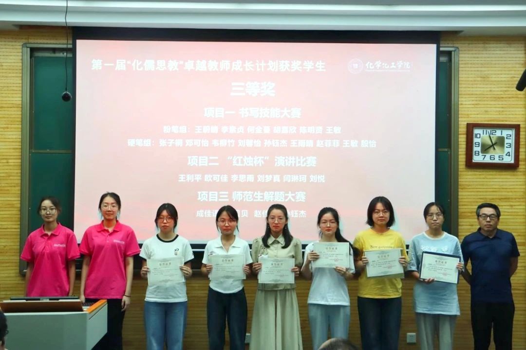 第一届“化儒思教”卓越教师成长计划获奖学生名单》。贾颍辉、刘伟、岳宣峰分别为“化儒思教”卓越教师成长计划获奖学生代表颁发证书和奖品,并合影留念。