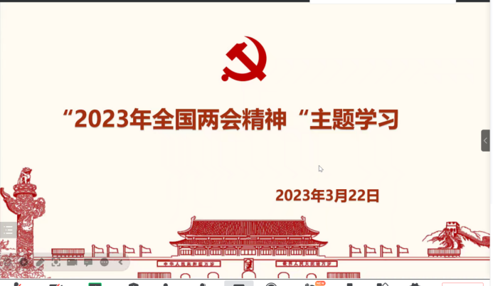 2023年3月22日晚,历史学硕士党支部组织开展了关于“2023年全国两会精神”的学习活动。本次学习活动由支部组织委员赵桐欣同志主持,支部38位党员同志(含预备党员)参与。学习内容围绕“2023年全国两会精神”展开,重点学习中国共产党第二十届中央委员会第二次全体会议内容、《政府工作报告》以及《党和国家机构改革方案》的相关内容,本次学习由学科历史党小组负责领学。
