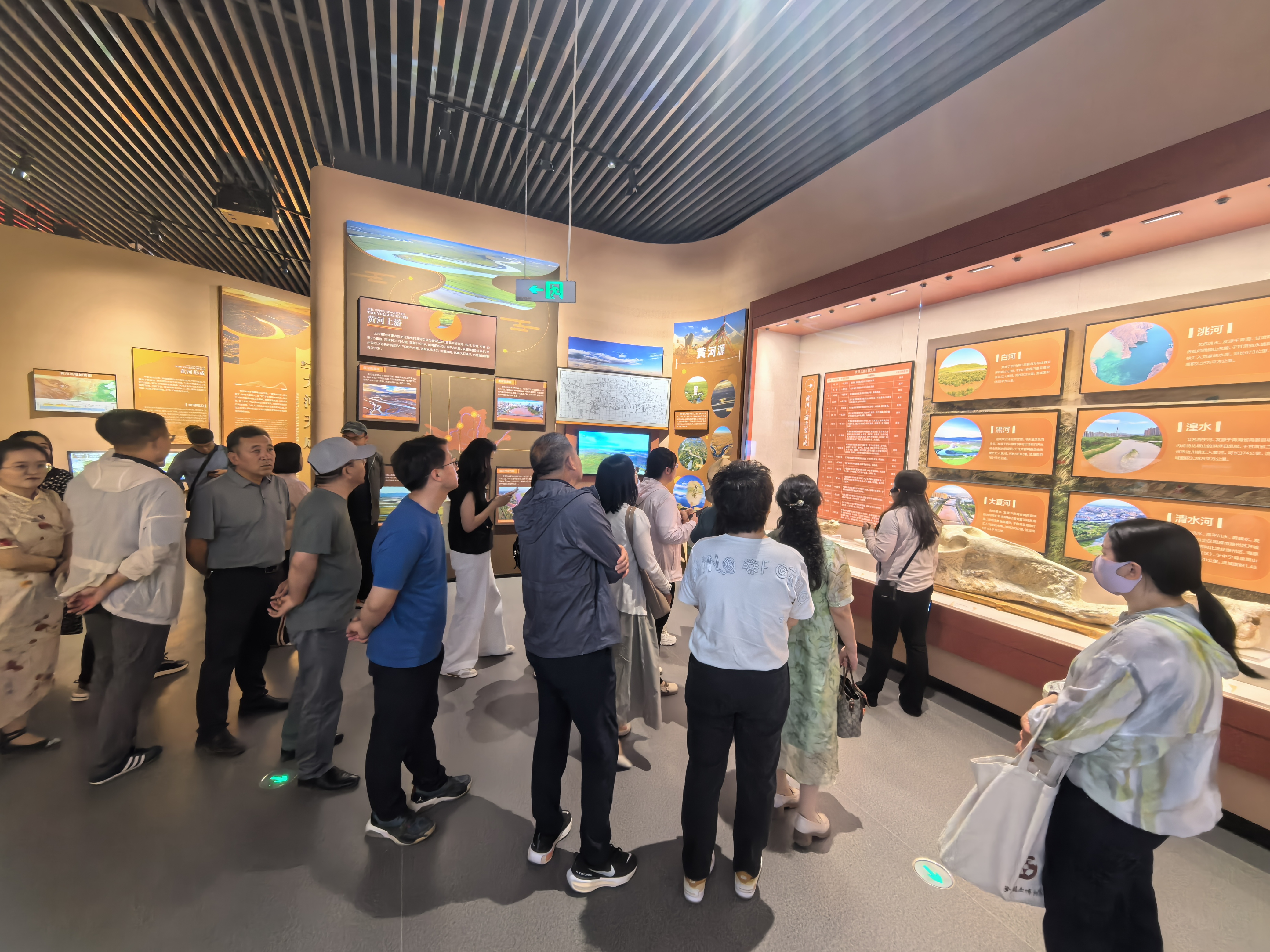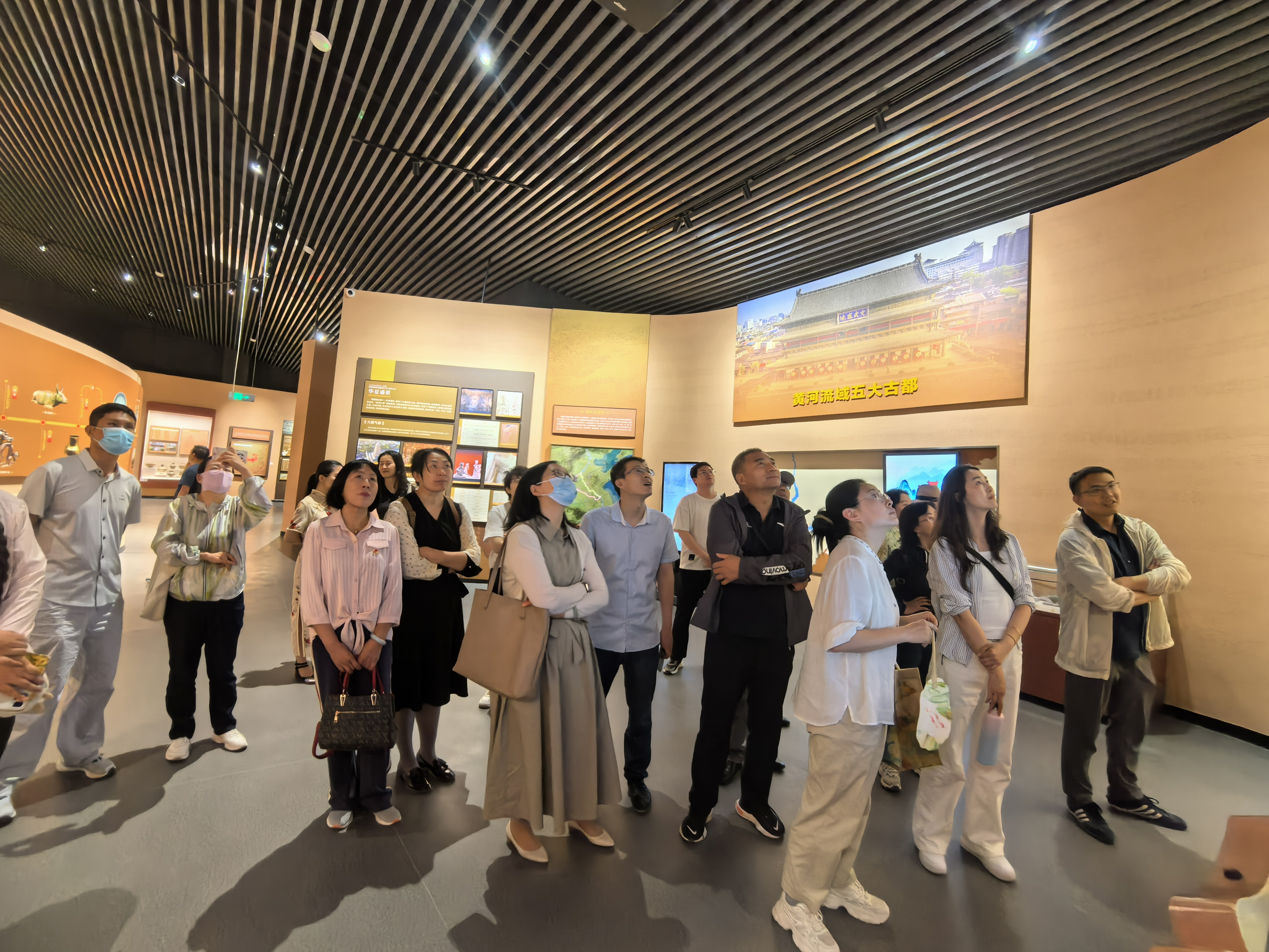 黄河宁夏世界灌溉遗产工程遗产展示中心,在讲解员的讲解下,依次参观了序厅、黄河母亲厅、灌区千秋厅、塞上兴水厅四大展区,通过大量的实物展品、历史照片和多媒体技术,全方位展示了黄河形成发展演进、历代治水先贤的丰功伟绩和宁夏引黄古灌区作为世界灌溉遗产2000多年的悠久历史、璀璨文化和辉煌成就。大家纷纷表示,要牢记习近平总书记赋予宁夏建设黄河流域生态保护与高质量先发展先行区的殷殷嘱托,将黄河文化融入教学科研中,讲好黄河故事,讲好中华文明故事,讲好中国故事,为黄河文化的保护传承与创新发展做出应有的贡献。