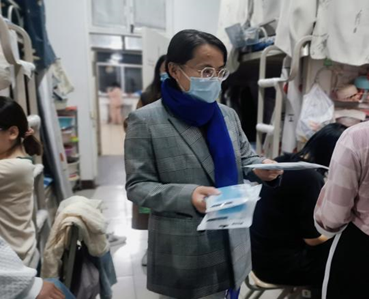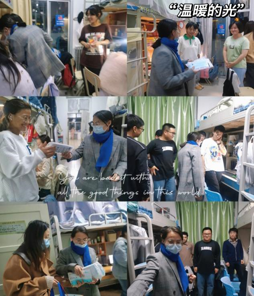 办公室刘菲老师深入学生宿舍,了解学生思想动态、倾听学生心声,并为学生发放防疫物资,确保学生能够获得及时、有效的暖心关爱和防疫保障。