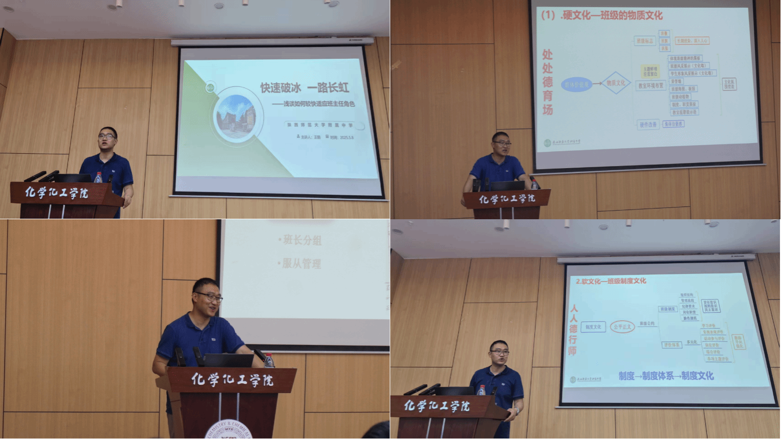 王鹏作主题为《快速破冰,一路长虹——浅谈如何快速适应班主任角色》的报告,由张学鹏副教授主持。王鹏指出,班主任不仅是班级管理者,更是学生成长的引路人,担任班主任不仅能提升个人组织协调能力,还能在与学生的互动中获得成就感与幸福感。他结合自身经验,分享了班级分组实践的多种尝试,包括自由组合、成绩分配、学生自行安排等方法,并重点介绍了杨换青老师的综合分排位构建法,强调科学分组对班级管理和学生互助学习的重要性。针对班级文化和制度体系构建,他提出“硬文化—处处德育场,软文化—人人德行师”的班主任管理理念,通过班级文化墙和宣传栏的建设体现班级特色,规章制度通过民主讨论形成,增强学生的归属感和规则意识。最后他以亲身经历叮嘱同学,担任班主任需要耐心、细心和爱心,要善于倾听学生需求,灵活调整管理策略。