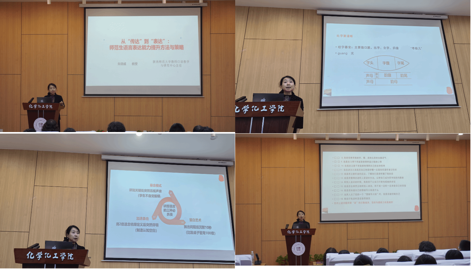 朱晓彧作主题为《从“传达”到“表达”——师范生语言表达能力提升方法与策略》的报告,由陈亚芍教授主持。朱晓彧基于丰富的教学经历以及平时授课中同学们常提出的问题,以“声音、沟通、语商”三大维度为主线,结合生动案例与实操技巧,系统阐述了语言表达的核心要素及提升路径。她指出,教师应将声音作为核心武器,平时注重音色的温暖悦耳、语调的抑扬顿挫、语速的张弛有度以及音量的精准调控,通过科学发声训练与情感注入,使声音成为传递知识、感染学生的有效载体。朱晓彧还通过模拟课堂互动、家校沟通等场景,向同学们示范了如何运用停顿强调、重音突出、节奏变化等技巧增强语言感染力。