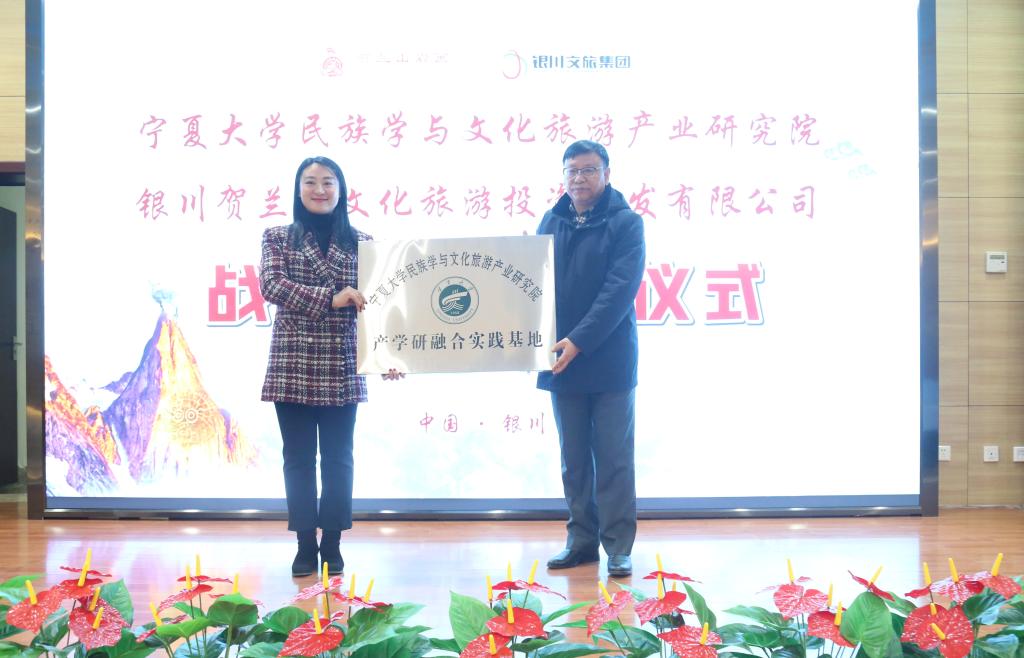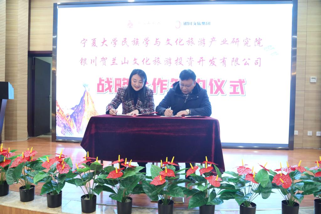 拉斯维加斯娱乐城官网西夏学研究院(民族学与文化旅游产业研究院)院长杜建录教授和银川贺兰山文化旅游投资开发有限公司运营总监李佳代表双方签署了产学研战略合作协议,并为“ 拉斯维加斯娱乐城官网
