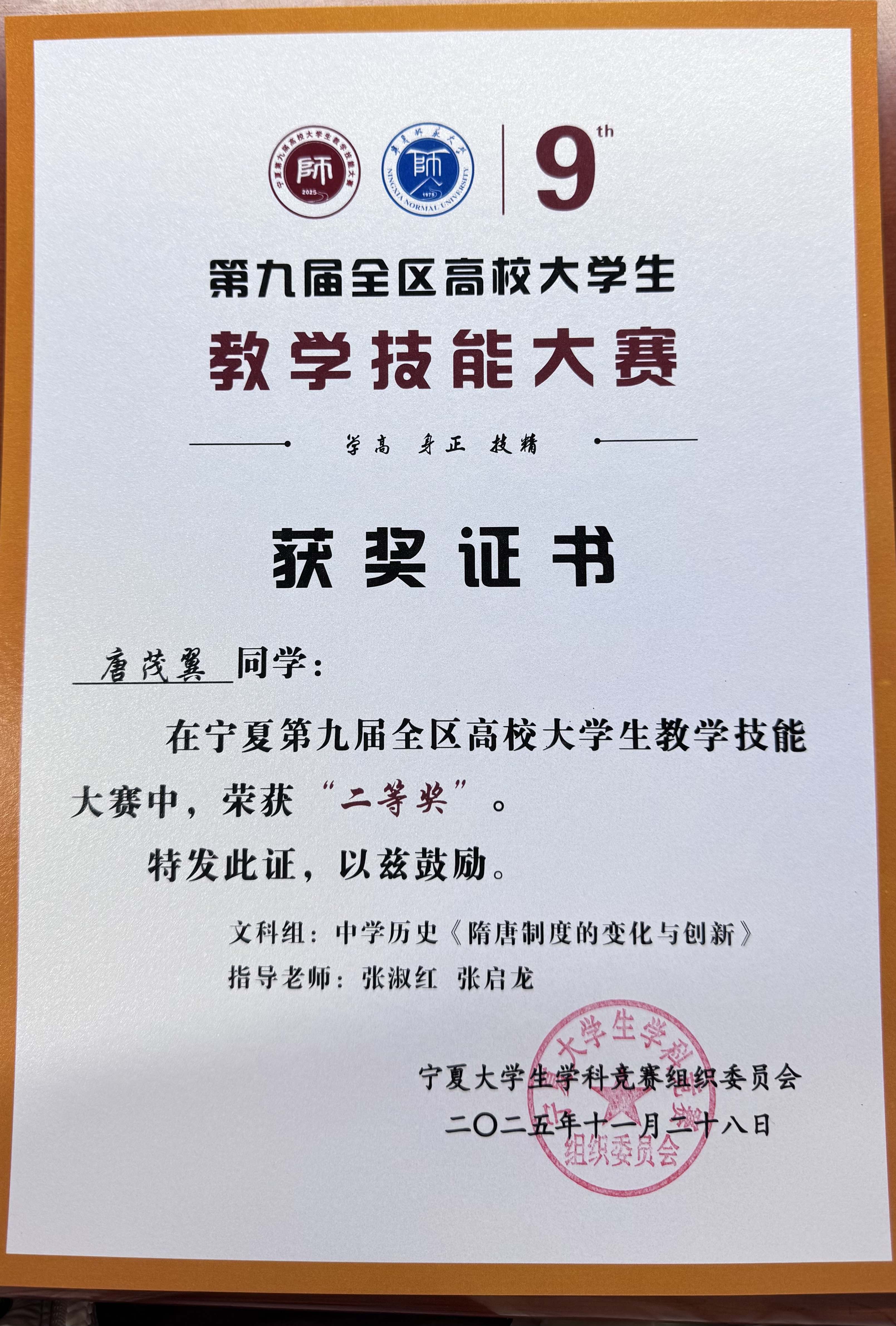 历史学科唯一晋级决赛的选手,凭借《隋唐制度的变化与创新》一课的扎实表现,荣获文科组(中学历史)二等奖,指导教师张淑红、张启龙荣获优秀指导教师奖。