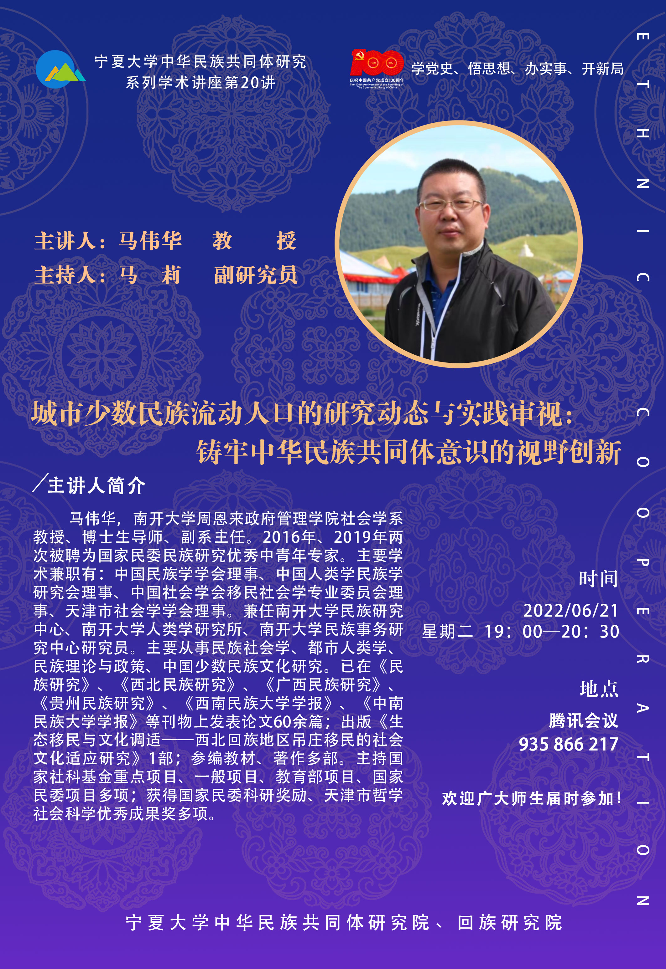 社会学系教授、博士生导师、副系主任。2016年、2019年两次被聘为国家民委民族研究优秀中青年专家。主要学术兼职有:中国民族学学会理事、中国人类学民族学研究会理事、中国社会学会移民社会学专业委员会理事、天津市社会学学会理事。兼任南开大学民族研究中心、南开大学人类学研究所、南开大学民族事务研究中心研究员。主要从事民族社会学、都市人类学、民族理论与政策、中国少数民族文化研究。已在《民族研究》、《西北民族研究》、《广西民族研究》、《贵州民族研究》、《西南民族大学学报》、《中南民族大学学报》等刊物上发表论文60余篇;出版《生态移民与文化调适——西北回族地区吊庄移民的社会文化适应研究》1部;参编教材、著作多部。主持国家社科基金重点项目、一般项目、教育部项目、国家民委项目多项;获得国家民委科研奖励、天津市哲学社会科学优秀成果奖多项。