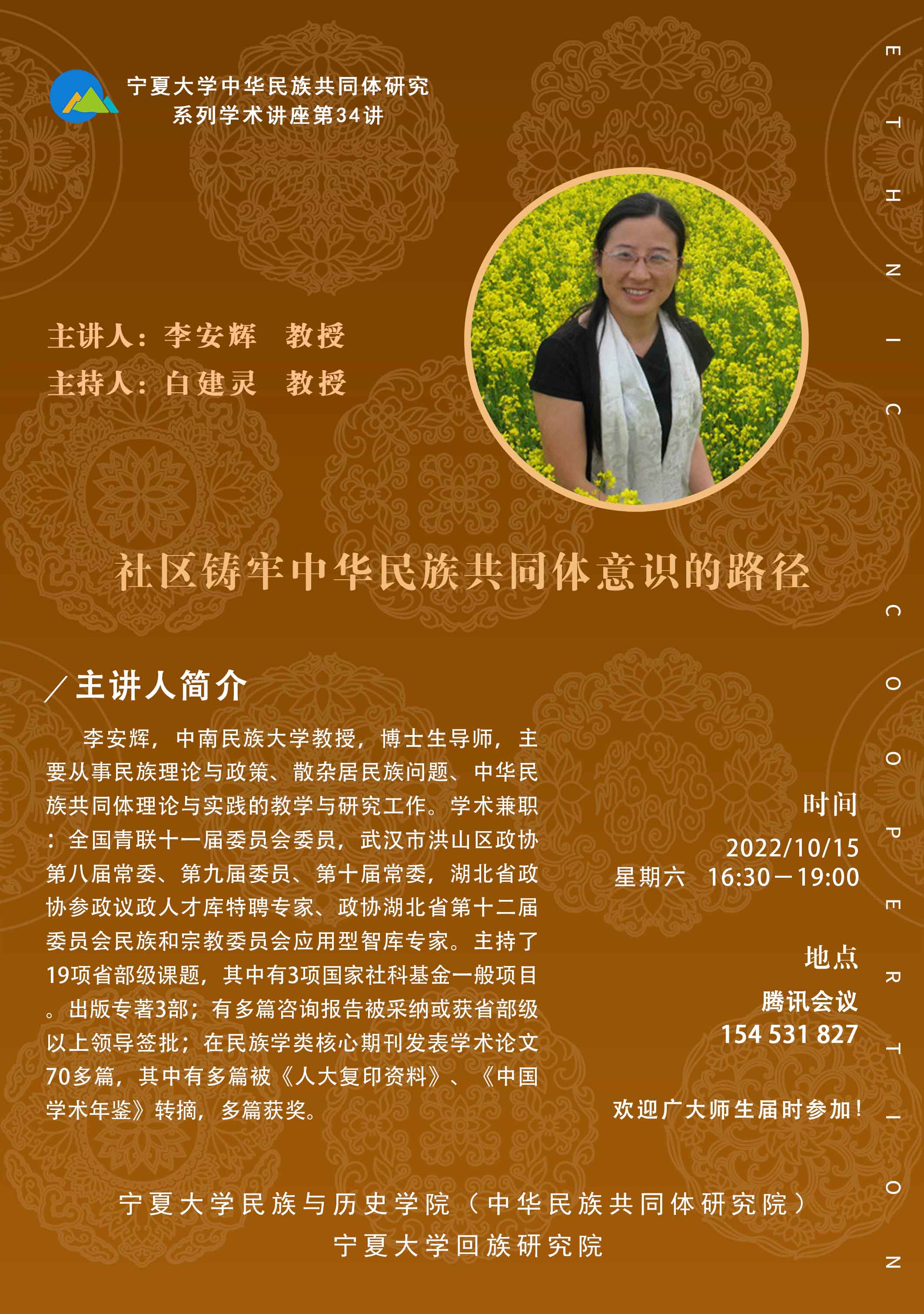 李安辉,中南民族大学教授,博士生导师,主要从事民族理论与政策、散杂居民族问题、中华民族共同体理论与实践的教学与研究工作。学术兼职:全国青联十一届委员会委员,武汉市洪山区政协第八届常委、第九届委员、第十届常委,湖北省政协参政议政人才库特聘专家、政协湖北省第十二届委员会民族和宗教委员会应用型智库专家。主持了19项省部级课题,其中有3项国家社科基金一般项目。出版专著3部;有多篇咨询报告被采纳或获省部级以上领导签批;在民族学类核心期刊发表学术论文70多篇,其中有多篇被《人大复印资料》、《中国学术年鉴》转摘,多篇获奖。