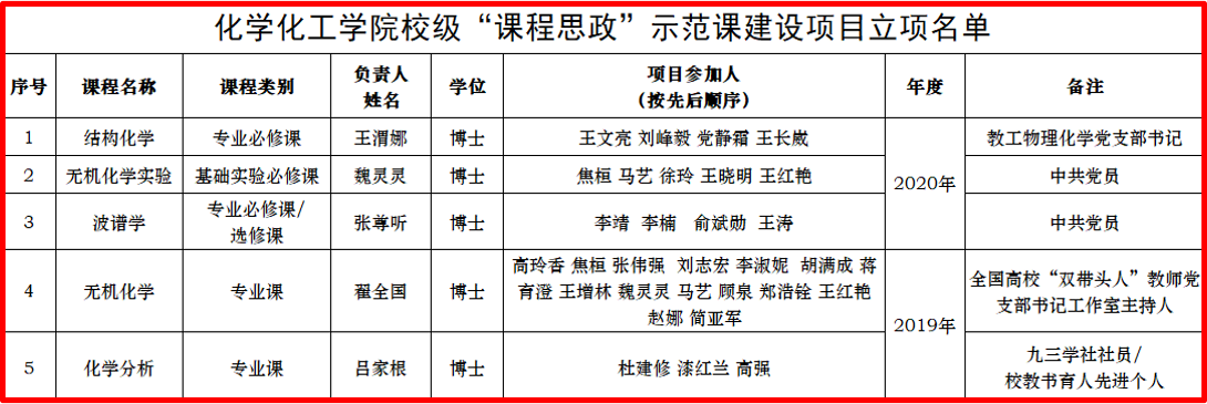 教师党支部坚持育人导向、突出价值引领,主动肩负起推进“课程思政”建设的主题责任。一是支部书记和党员骨干教师带头申报“课程思政”项目。在去年无机教工党支部书记翟全国主持申报课程思政示范课建设项目之后,教工物理化学党支部书记王渭娜、教工无机化学党支部教师党员魏灵灵主持申报了《结构化学》、《无机化学实验》课程思政示范课建设项目。二是带动全体教师树立“课程思政”理念。教工有机化学党支部结合社会热点事件展开研讨,引导支部教师挖掘专业知识中的思政教育功能、教育元素、融入路径,润物无声地达成立德树人目标。三是名师带路探讨“课程思政”建设思路。教工物理化学党支部党员、国家级教学名师房喻老师带领支部教师共同探讨“课程思政”建设思路。房老师强调要从学科特色出发,强化课程思政建设和学科育人,着重培养学生养成科学思维和正确的价值观。