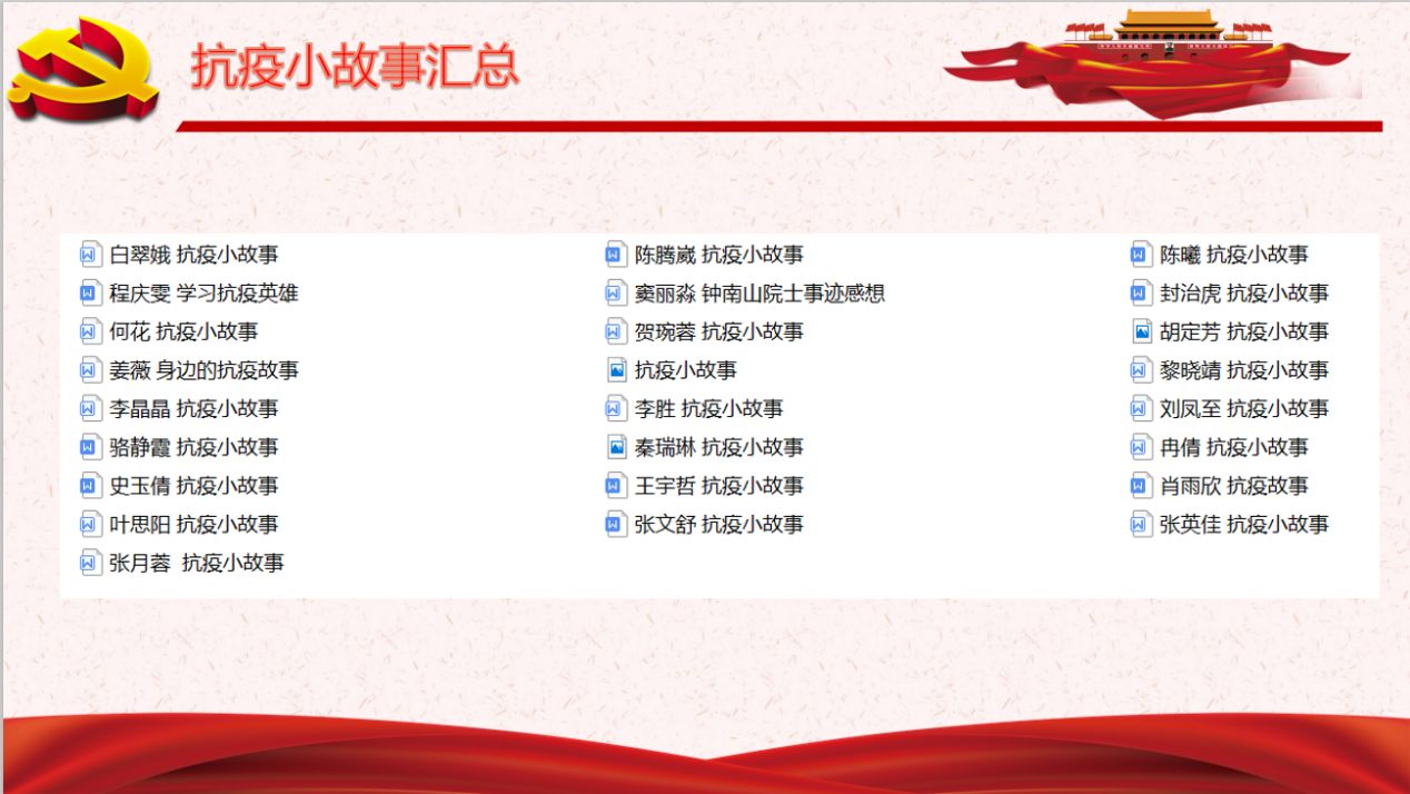 为保障师生安全,积极做好防控工作的事迹;魏济明同志分享了2020届毕业生谭秋慧为基层防疫助力,主动前往社区服务站成为志愿者的事迹。会议之后,一部分同志将自己身边的战“疫”故事和感想制作成文档进行了分享。