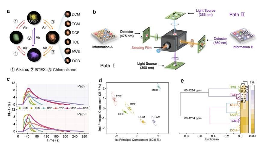 图2 单组分阵列型荧光传感器应用。(a)Ph-3CP 硅胶粉对烷烃、BTEX以及氯代烃饱和蒸气的可视化响应示意图(λex = 365 nm);(b)单组分阵列型荧光传感器装置示意图;(c)传感器对六种氯代烃的响应曲线;(d)基于二维主成分分析与(e)层次聚类分析区分六种氯代烃蒸气