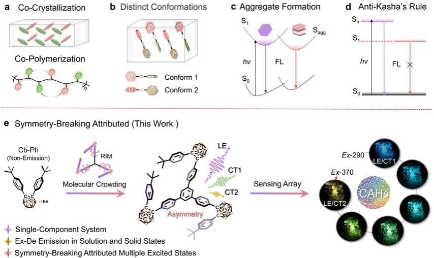 图1激发波长依赖多色发光分子设计策略。(a-d)已报道的激发波长依赖多色发光分子体系示意图;(e)对称性破缺的星型分子结构设计示意图