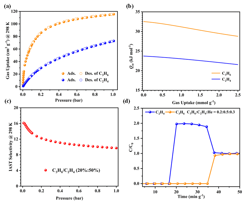 首先,在298 K、1 bar压力条件下测定了C2H4和C3H6在Quin-Zn-Ad-BTC上的吸附等温线。数据显示,该材料对C2H4和C3H6的吸附容量分别为72.9 cm3 g-1和115.5 cm3 g-1,其中对C3H6表现出优先吸附特性,其C3H6/C2H4吸附比达到约158%。这一选择性吸附现象进一步通过零覆盖条件下的吸附热焓(Qst)差异得到验证:C3H6的Qst显著高于C2H4。随后,我们采用理想吸附溶液理论(IAST)在298 K下评估了模拟MTO产物组成的二元混合气(C3H6/C2H4=0.2:0.5)分离性能在1 bar条件下,Quin-Zn-Ad-BTC对该混合物的体积比(C3H6/C2H4=0.2:0.5)选择性达到9.73。充分展现了Quin-Zn-Ad-BTC在常压丙烯/乙烯分离应用中的显著优势。穿透实验也证明了该材料具有分离MTO产物的能力(图4)。