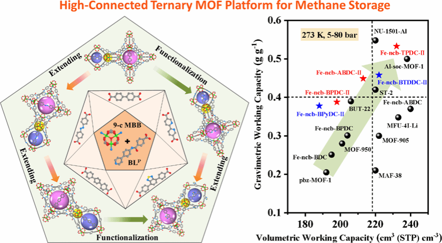 新概念传感器与分子材料研究院通过一个九连接的三基元MOF平台实现了质量比和体积比甲烷存储工作能力同高的材料(图1)。