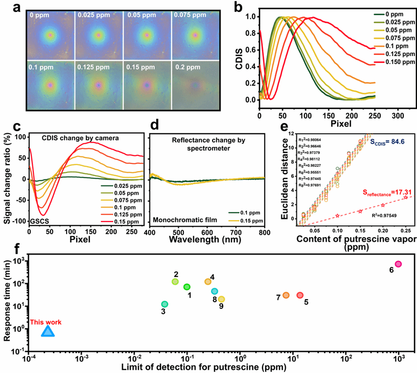 分别通过吸附膨胀和结晶膨胀机制用于湿度及腐胺蒸气检测。通过“曝光-显影”策略,我们成功实现了高湿度环境下海鲜腐败的实时监测。与专业光谱仪的反射率测量相比,布拉格图案分析在两种检测模式中均展现出2.6-5倍的灵敏度提升。这项工作为开发高性能、低成本比色传感器提供了新思路,其功能可媲美甚至超越笨重昂贵的现代光学传感器。