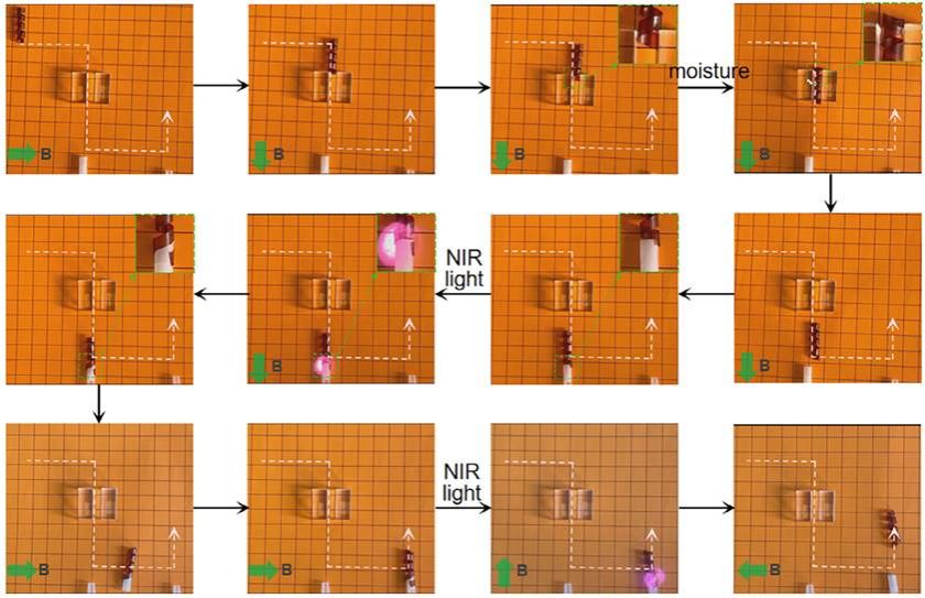 利用所制备材料的多重响应性与可图案化设计性,我们制备了螺旋状样品,并利用红外光与磁场进行协同控制,实现了二维受控运动与物品搬运(图3)。