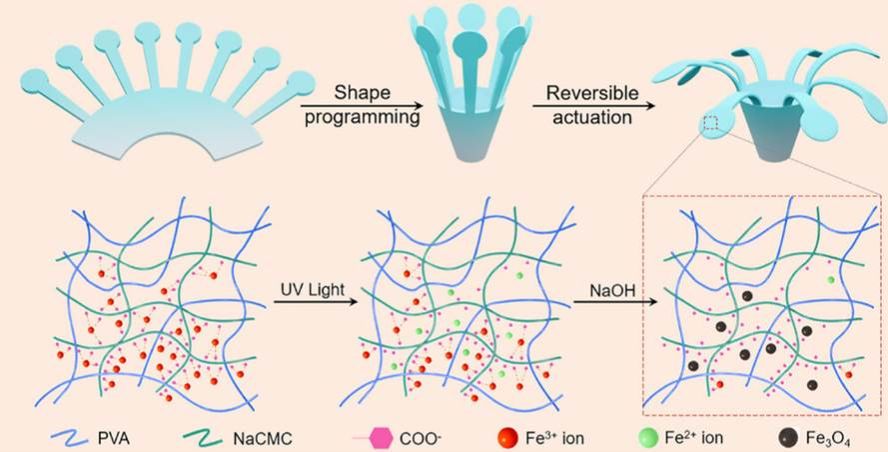 针对此,我们利用铁离子光氧化还原反应,在高分子薄膜中原位合成了四氧化三铁(Fe3O4)磁性纳米粒子:制备了含羧酸根的互穿交联网络作为高分子基底,通过浸泡引入铁离子与羧酸根形成配位交联结构,再通过调节光照时间与位置,使不同区域铁离子发生不同程度还原,进而控制碱性条件下两种离子生成Fe3O4纳米粒子的量(图1)。