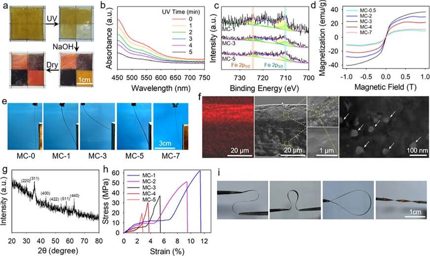 利用光照在时空控制方面的优势,制备了具有图案化Fe3O4分布的薄膜(图2a)。紫外-可见光谱(图2b)和XPS(图2c)证实了铁离子在紫外光照下被逐渐还原。磁滞曲线证明Fe3O4的生成量由铁离子还原程度决定(图2d),且材料磁性能够通过控制Fe3O4生成量进行有效调节(图2e)。EDS-Mapping和SEM结果表明生成的Fe3O4粒径小于100 nm,且大小与分布均匀图(2f)。XRD佐证了生成Fe3O4的晶体结构(图2g),力学性能测试表明四氧化三铁的引入提升了材料力学性能(图2h,i)。