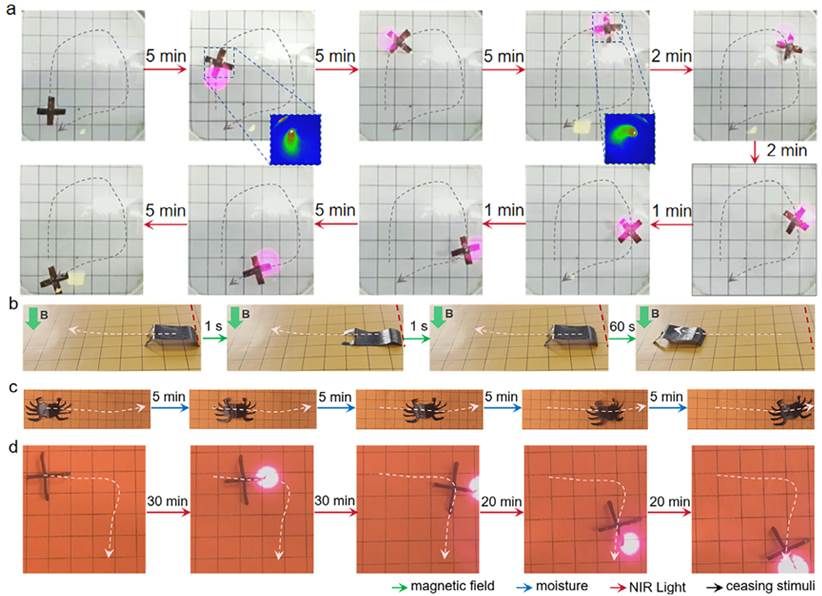 Fe3O4除了能在磁场下产生驱动力,其光热转换与吸湿调节性能还赋予材料红外光与湿度响应功能。我们展示了具有图案化Fe3O4分布样品在不同刺激下的变形行为,包括:1. 红外光控制下薄膜样品在气-液界面进行圆周运动;2,3. 磁场与湿度控制下样品沿预设路径线性运动;4. 光照控制样品二维运动(图3)。