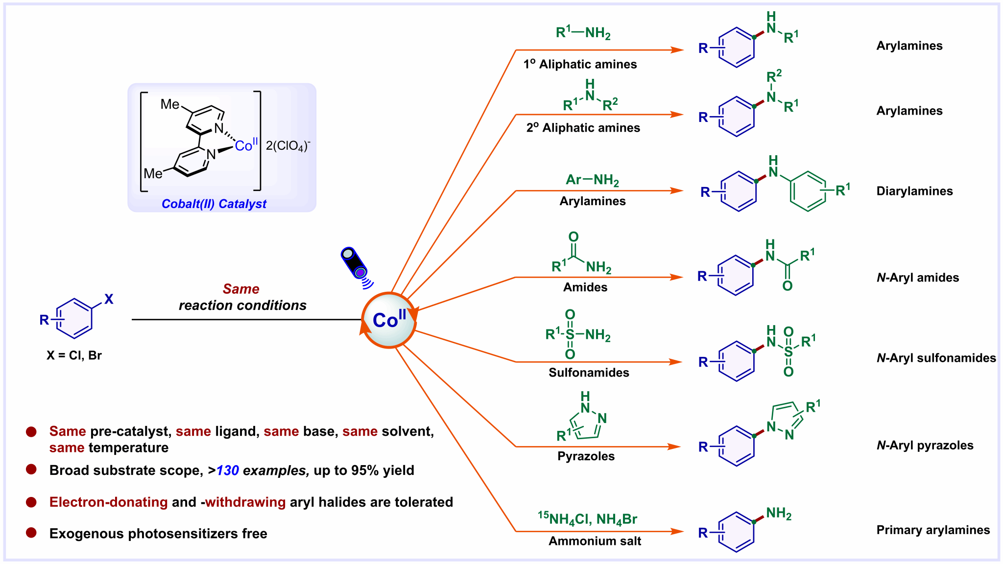过渡金属催化的C-N偶联反应为芳胺及其衍生物的合成提供了重要方法,已成为药物合成领域最常用的20个反应之一。然而,默克公司(Merck)的研究表明:基于∼10000个实例的数据分析,C-N偶联反应的失败率仍然高达 35%。究其原因,目前广泛使用的过渡金属催化剂体系在很大程度上依赖于各种特定配体、前催化剂的设计、合成,以及针对不同类型的含氮底物开展的催化剂筛选和反应条件的逐一优化,导致缺乏通用性C−N偶联反应催化剂体系。为突破这一瓶颈,基于机器学习、人工智能与高通量实验(HTE)结合筛选反应条件的策略近年来得到了快速发展。考虑到C-N 偶联反应在合成化学中的重要性,开发通用性 C-N 偶联催化剂新体系(使用相同的前催化剂、配体、溶剂、碱和温度)为C-N偶联反应的发展提供了新的策略。钴(Co)是一种低毒且储量丰富的金属,由于其高的催化活性,钴催化剂被视为贵金属催化剂的理想替代品。Co催化剂在C-C键交叉偶联反应领域已经得到了广泛的应用,但是在构筑C-N键方面的应用还十分有限。拉斯维加斯娱乐城官网