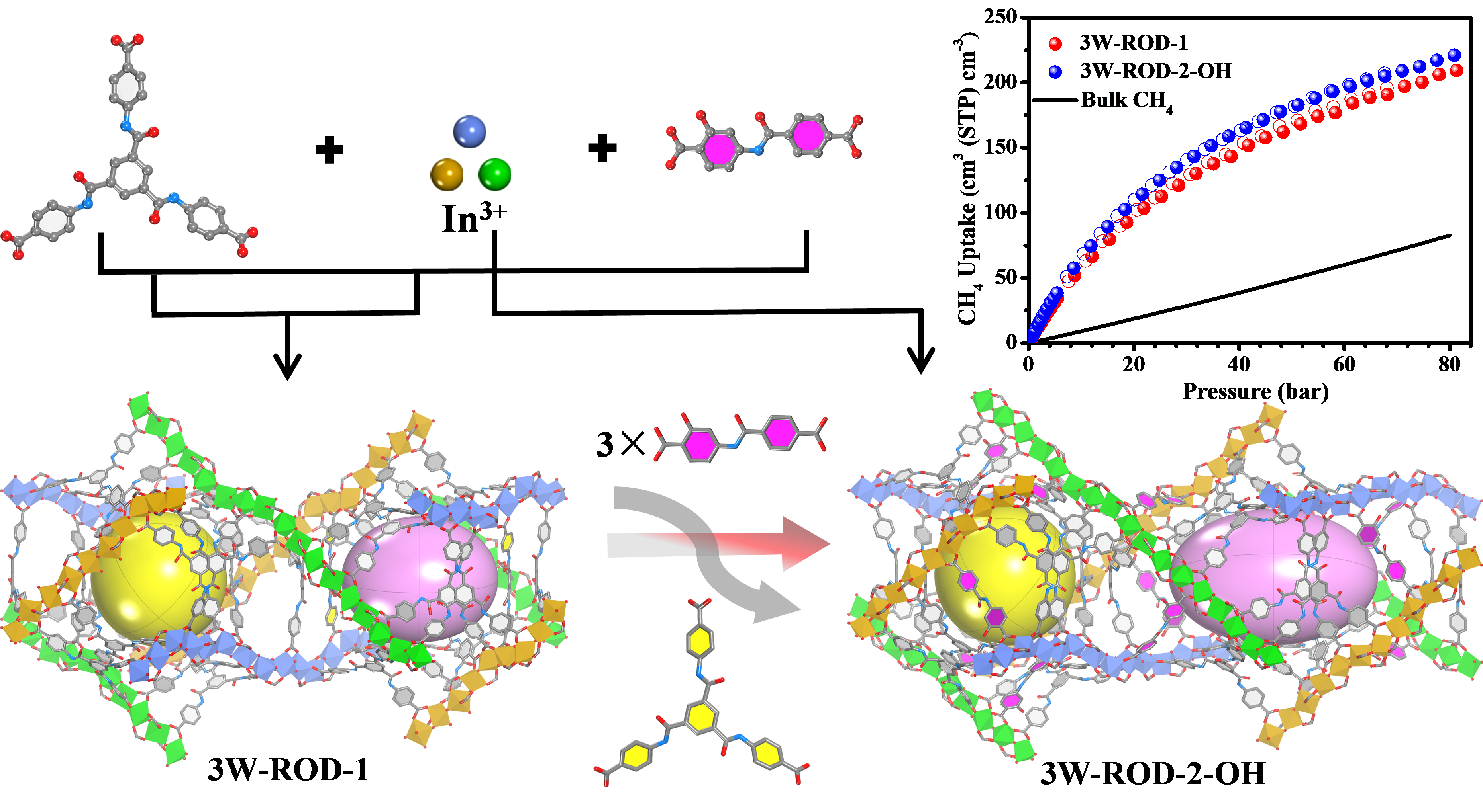 清洁能源的使用和低能耗的吸附分离技术对于缓解人们面临的能源短缺与环境问题具有重大意义,也与我国政府去年提出的碳达峰、碳中和“双碳”目标息息相关。为此,设计合成结构新颖的、存储和分离高效的多孔固体材料成为科学家们亟待解决的问题。金属有机骨架(MOF)材料作为一类新兴的多孔固体材料,在该领域具有潜在的应用前景,不过仍存在存储和分离效率低下的问题。针对这一现状,近年来我们团队致力于探索和设计合成结构新颖的金属有机骨架材料,在清洁能源甲烷的存储和轻质碳氢化合物的吸附分离方面取得了初步的进展。