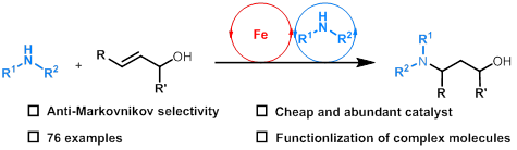 氢胺化反应是将烯烃、炔烃等基本化工原料转化为高附加值胺类化合物的一类重要转化过程。由于氢胺化反应可以生成马氏和反马氏两种产物,氢胺化反应中的化学选择性控制一直是该反应中的一大难题。课题组基于氢转移的策略,发展了基于廉价铁催化的烯丙醇反马氏氢胺化和氢酰胺化反应,实现了系列γ-氨基醇类化合物的绿色合成。该催化体系具有高反马氏选择性、反应条件温和、底物范围广泛、官能团耐受性好等优点;且反应中手性底物的立体构型在产物中能得到保持,可以有效的对手性氨基酸,天然产物和药物分子等复杂分子进行修饰。机理研究表明,反应通过两个协同的催化循环进行,即Fe-PNP络合物催化脱氢/氢化过程和胺底物作为有机催化剂促进的迈克尔加成过程。该催化体系对氢胺化反应的类型进行了有效拓展,并为胺类化合物的合成提供了新思路。相关结果发表在Journal of the American Chemical Society杂志上,拉斯维加斯娱乐城官网