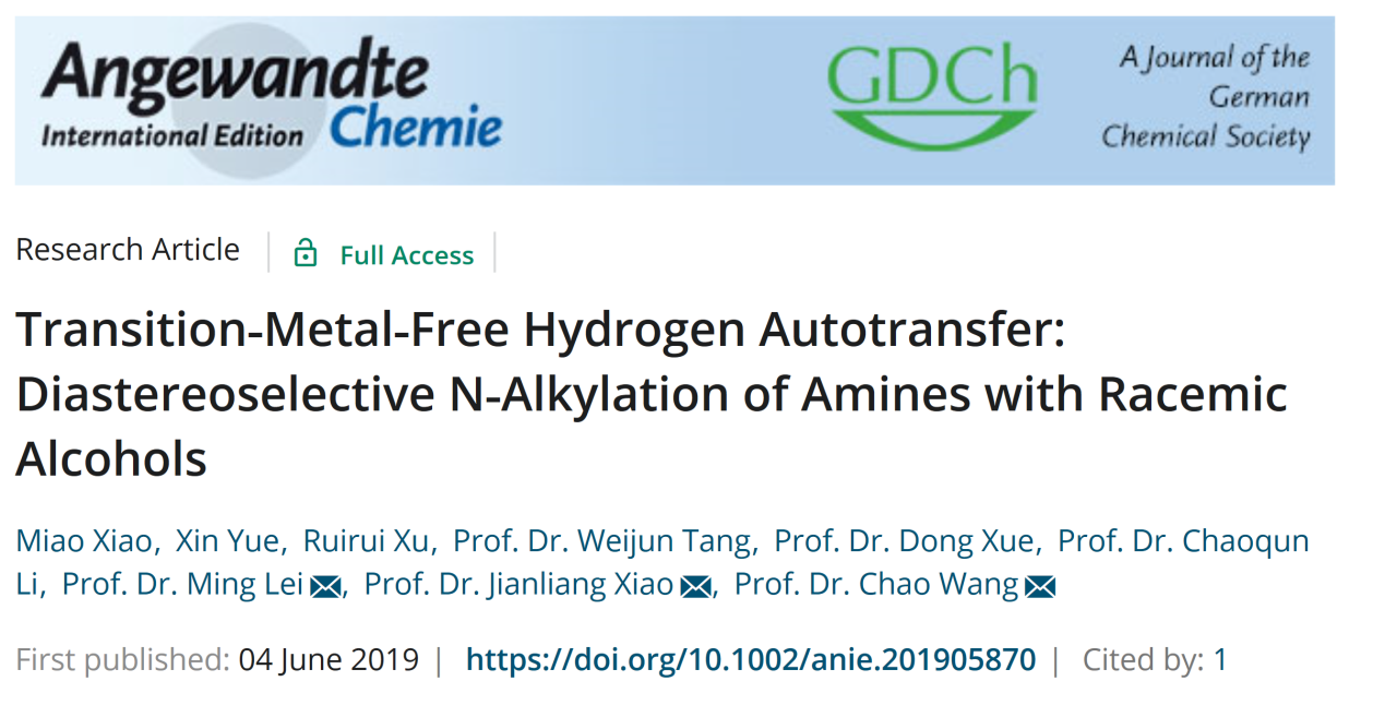 手性胺类物质是合成药物分子和精细化学品最为重要的一类中间体。不对称氢化是合成手性胺类物质使用较多的一类方法。例如除草剂(S)-metolachlor的合成中就以铱催化的亚胺不对称氢化(80 bar H2, >10000 吨/年)作为关键步骤。但是,亚胺不对称氢化仍然存在一些问题:1. 亚胺中间体稳定性差,不易分离;2. 氢气的使用有潜在危险;3. 手性伯胺的直接制备较困难。基于氢转移(借氢)策略,醇对胺的不对称烷基化能避免上述存在的一些问题,是合成手性胺类物质的一条较理想途径。目前已有一些成功的体系报道,但均需使用Ir或Ru等贵重的过渡金属催化剂。过渡金属残留是制药工业面临的一大问题,因此发展无过渡金属参与的手性胺合成具有重要意义。