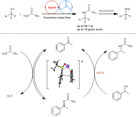 基于氢转移策略,课题组发展了一例无过渡金属催化合成手性胺的方法,并通过和北京化工大学的雷鸣教授合作对反应机理进行了阐述。研究发现,在催化量的NaOH和酮存在下,消旋仲醇能和手性叔丁基亚磺酰胺反应得到高非对映选择性的手性胺类物质。该反应可以用来制备各种α-手性芳胺类化合物。反应原料和催化剂易得,可以放大到10 g级规模制备,反应产物可通过简单的酸解得到手性伯胺。特别重要的是,当使用氘代消旋仲醇时,能以高的氘代率和非对映选择性得到相应的氘代手性胺,并可应用于氘代手性药物的合成,如NPS R-568和(S)-Rivastigmine。该反应为手性胺的制备提供了一种简便的方法;由于没有过渡金属参与、操作简便,该方法具有在工业,特别是制药工业上制备手性胺的应用前景。