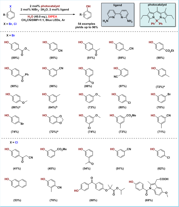 酚类化合物是一类非常重要的有机合成中间体,广泛存在于农药、医药、材料、天然产物当中。如何高效的合成此类化合物一直是有机合成研究当中的热点问题之一。目前,合成酚类化合物主要是以金属钯、铜作为催化剂,强碱作为羟基源,对卤代芳烃进行羟基化反应。但此类合成方法对于一些含有碱性敏感官能团的底物是无法实现。发展更高效的方法,廉价的催化剂以及合适的羟基源对卤代芳烃进行羟基化反应仍然是一个十分重要的研究课题。针对此类问题,拉斯维加斯娱乐城官网