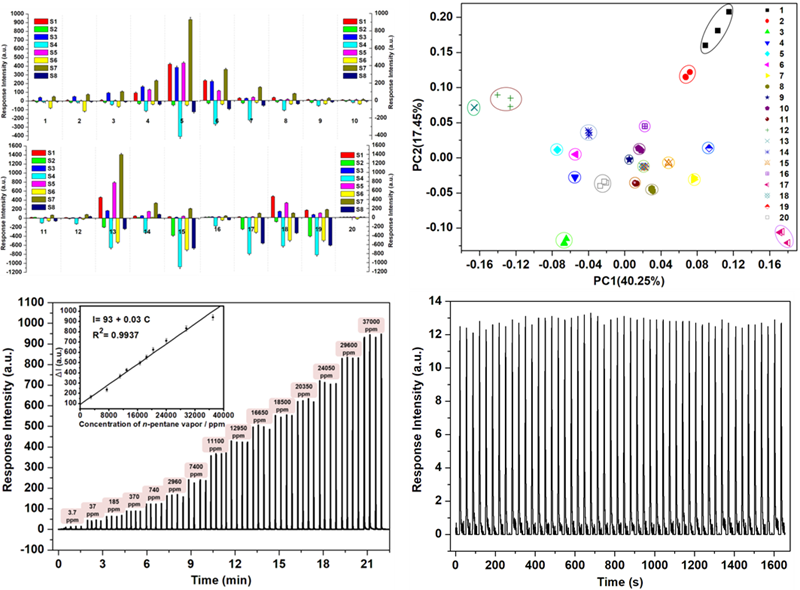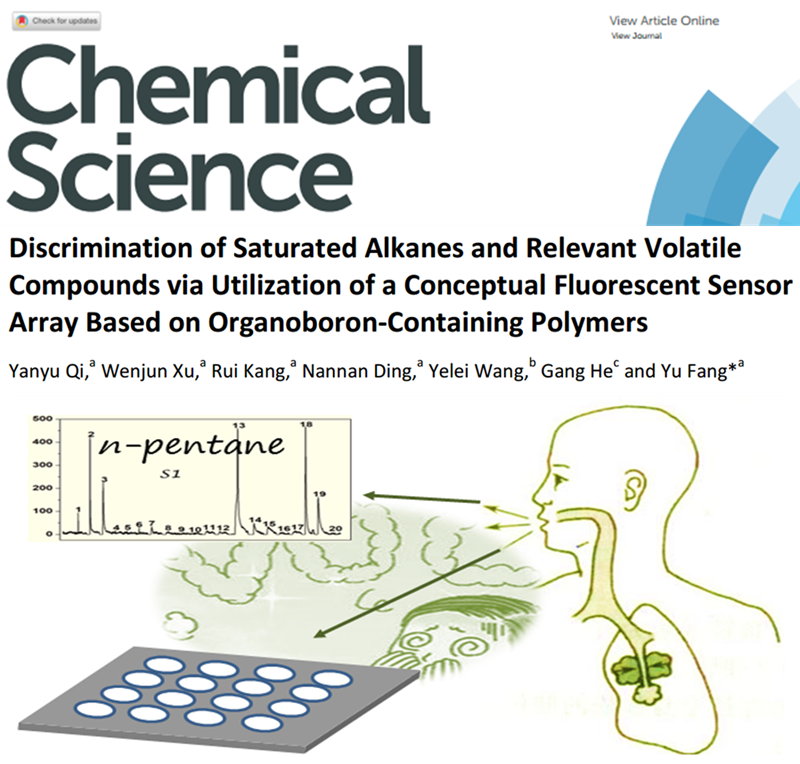 饱和烷烃是一类重要的信号物质,在消化系统、呼气系统某些疾病,特别是肺癌的早期诊断,油气资源的普查勘探中具有重要的意义。然而,饱和烷烃化学性质稳定,也缺乏光电活性,这就使得其原位在线高灵敏探测变得十分困难。针对这一挑战,房喻教授小组创造性将非平面荧光单元引入薄膜结构,制备了富含“分子通道”的荧光薄膜阵列,利用内聚能差异,薄膜通道的体积选择、极性选择,以及传感单元荧光量子产率的溶剂依赖性等,在自行搭建的系统上实现了对饱和烷烃的气相高灵敏选择性快速识别和检测。对肺癌标示物正戊烷的检测灵敏度可达3.7 ppm以下,系统响应速度小于1 s,且可实现稳定重复使用,有望在肺癌早期诊断中获得应用。该工作近期在化学领域顶级期刊《Chemical Science》上在线全文发表。论文第一作者为拉斯维加斯娱乐城官网