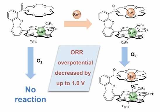 近日,曹睿教授团队报道了一种通过第二配位层悬挂Sc3+离子的CoIII咔咯来促进O2的活化,从而显著增强ORR电催化性能。通过引入Sc3+离子,该CoIII咔咯分子催化ORR的过电位在乙腈溶液中降低了1.0 V,在0.5 M H2SO4溶液中降低了170 mV。并且,第二配位层含有Sc3+的CoIII咔咯分子在0.5 M H2SO4溶液中ORR的半波电位为0.78 V (vs RHE),电子转移数为3.87。实验结果表明,悬挂的Sc3+促进了O2在CoIII咔咯分子上结合与活化,生成了CoIII-超氧-Sc3+咔咯阳离子自由基并通过多种光谱表征对该结构进行了验证,理论计算结果表明,氢氧根的离去进一步协助了O-O键的断裂过程。相关研究成果以“Promoted O2 Activation at a CoIII Center for Significantly Improved Electrocatalytic Oxygen Reduction Reaction”为题发表于Journal of the American Chemical Society期刊上,论文的通讯作者为曹睿教授、廖荣臻教授(华中科技大学)、张林娟教授(中科院上海应用物理研究所)和龙冉教授(中国科学技术大学),第一作者为李夏亮副研究员、靳晓童(博士后)和曹宇辰博士(华中科技大学)。论文链接: